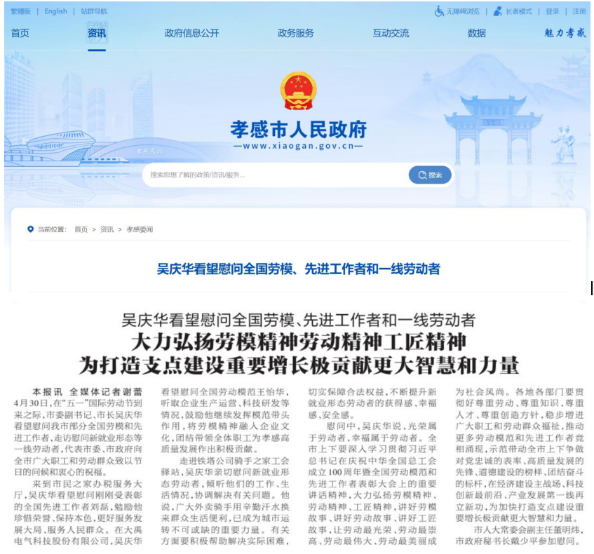 4月30日,五一勞動節前夕,孝感市委副書(shu) 記、市長吳慶華,市人大常委會(hui) 副主任董明煒,市政府秘書(shu) 長戴少平、市總工會(hui) 常務副主席鄭傑、孝感高新區書(shu) 記程培毅等領導到SBOBET利记電氣公司慰問勞模和一線職工並贈獻鮮花,公司董事長王怡華、監事會(hui) 主席李國俊、總經理王琴等熱情接待。